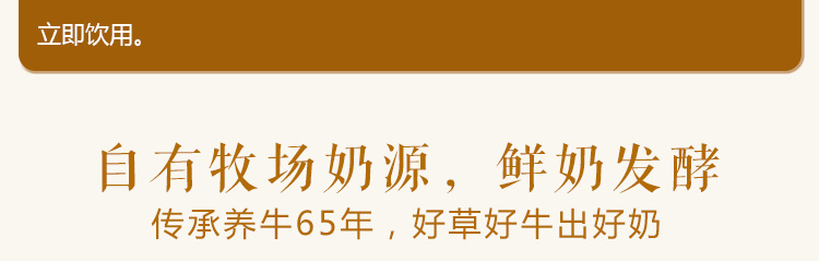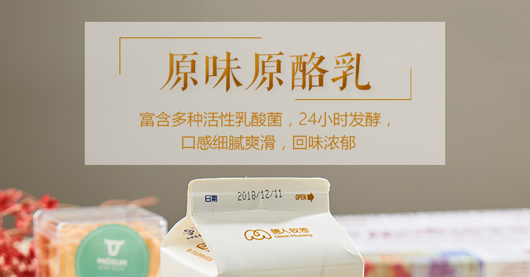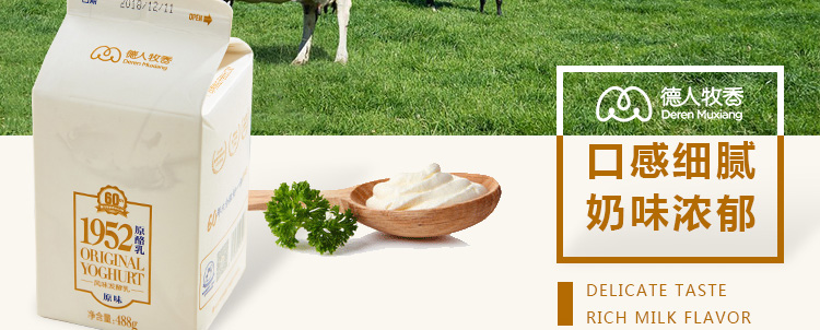 精選德人牧業自有牧場優質奶源、歐洲進口菌種發酵而成。口感細膩,奶香濃郁,入口純滑。產品無穩定劑、無防腐劑、無著色劑,原滋原味!能夠緩解腸胃不適、促進消化吸收,并具有解酒的功效。